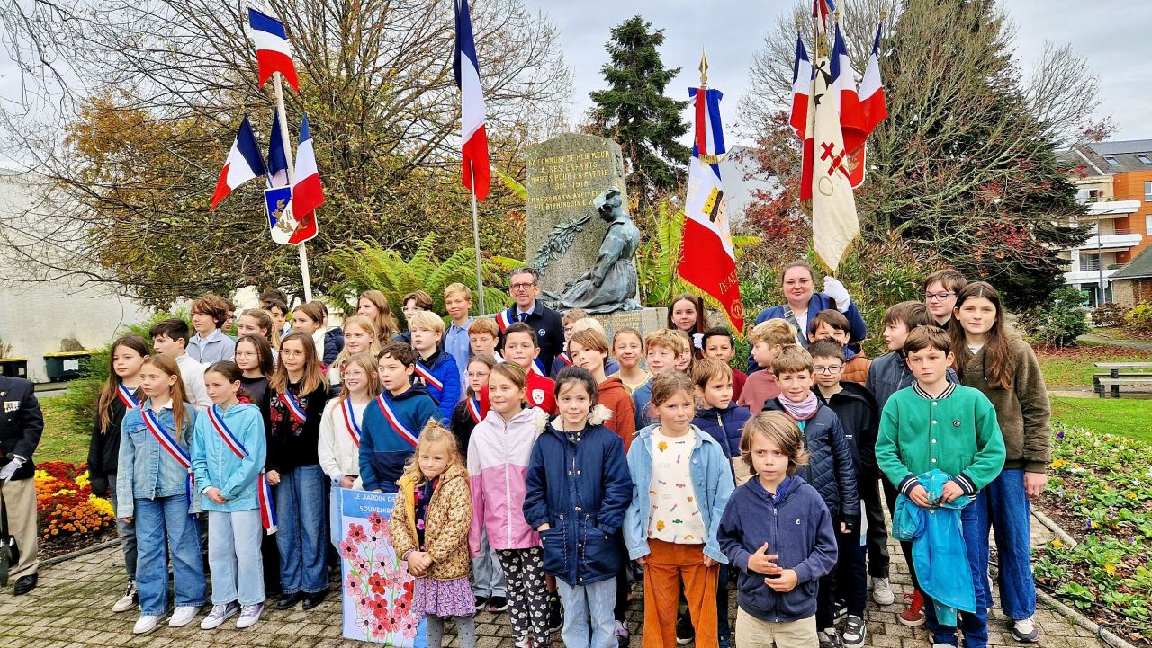 Ce mardi 11 novembre, une vingtaine d'élèves de notre école a participé à la 107e commémoration de l’Armistice, aux côtés des jeunes conseillers municipaux et des élèves du collège Charles de Gaulle, nouveaux fiers porte-drapeaux de la cérémonie.